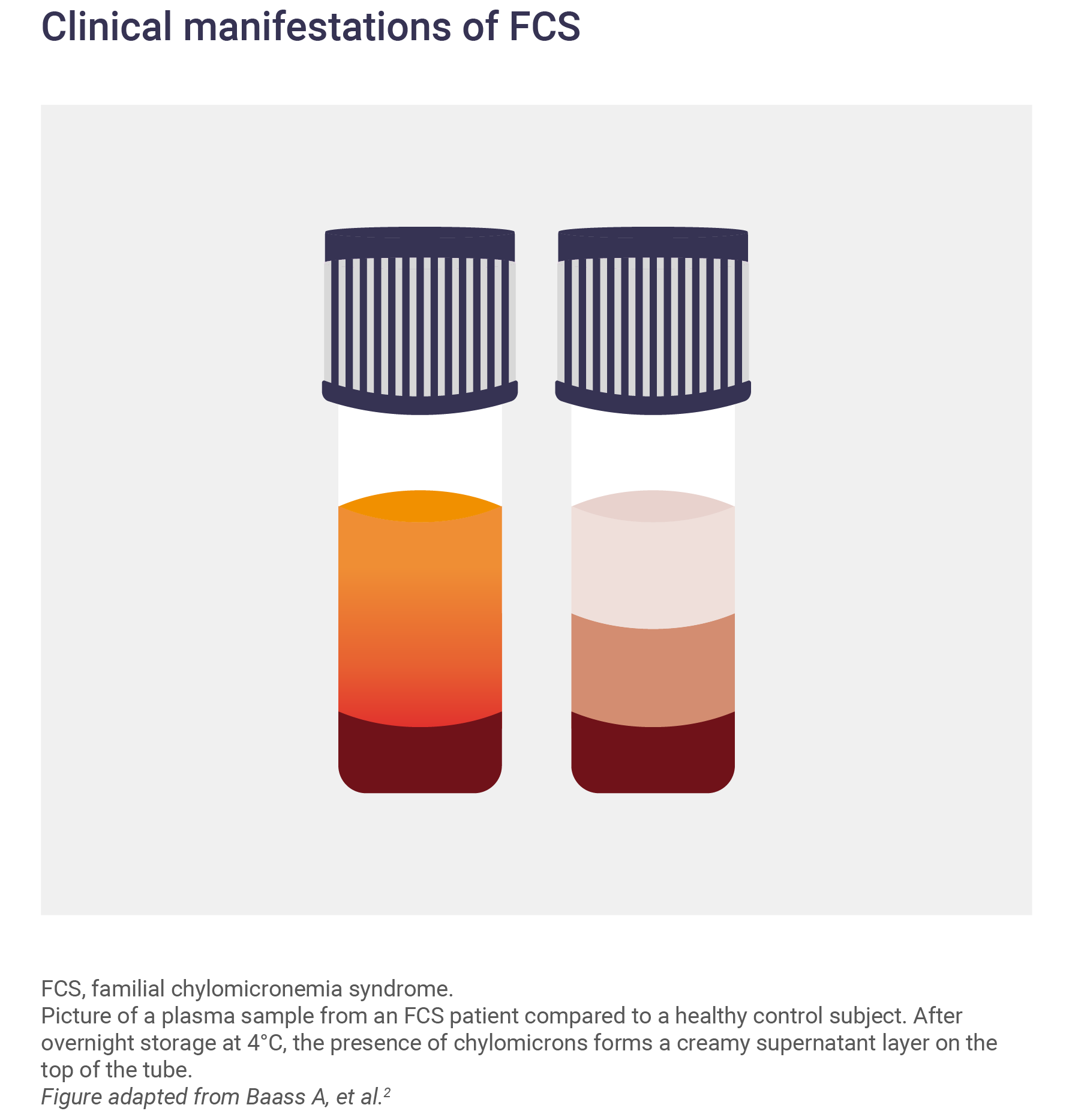 FCS is characterized by persistent chylomicronemia with high plasma TG levels (>1,000 mg/dL), even after a period of fasting.3,7