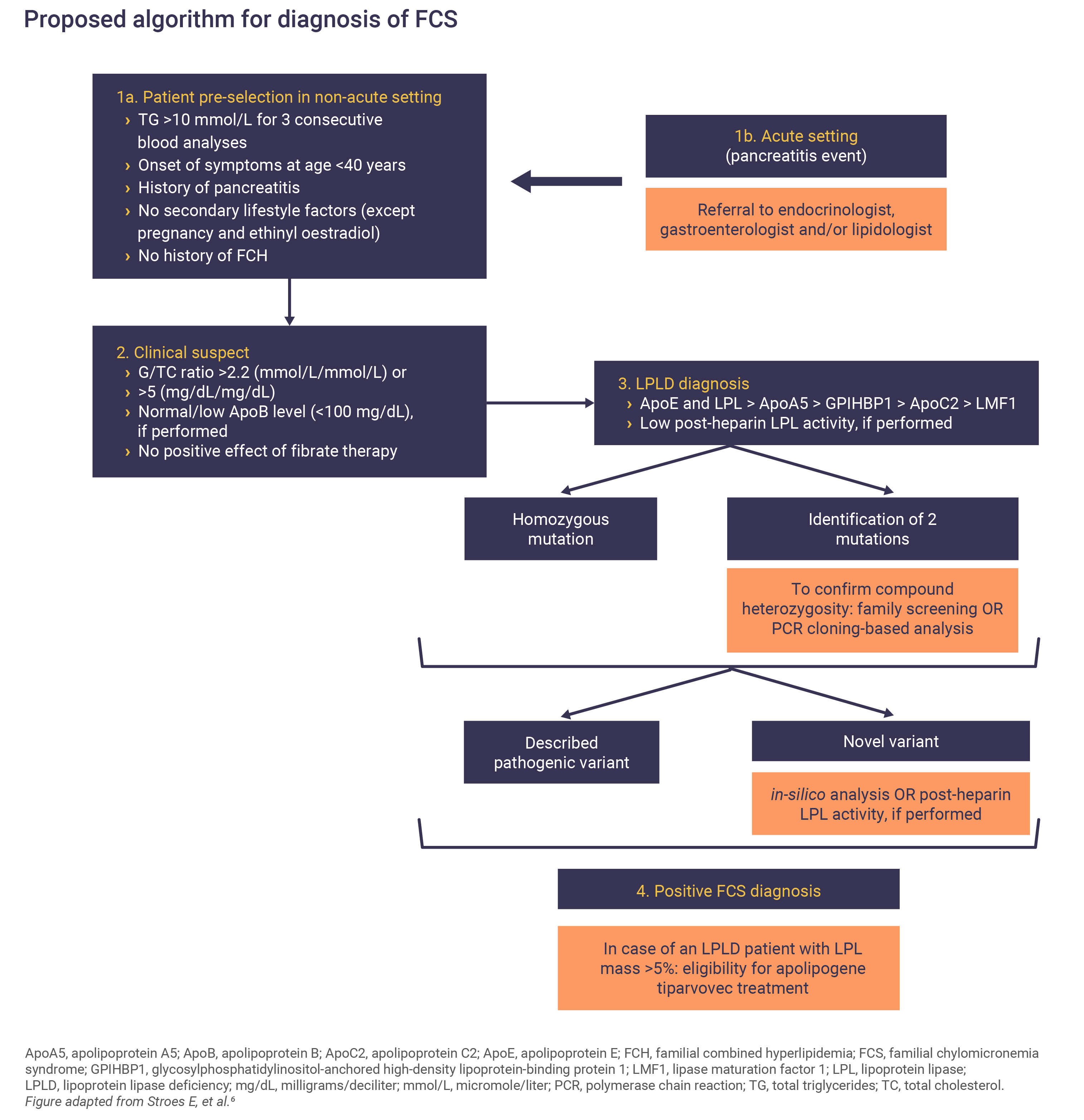 Genetic sequencing of LPL, APOC2, GPIHBPI, APOA5 or LMF1 to confirm the presence of a mutation is required to confirm an FCS diagnosis.3,6