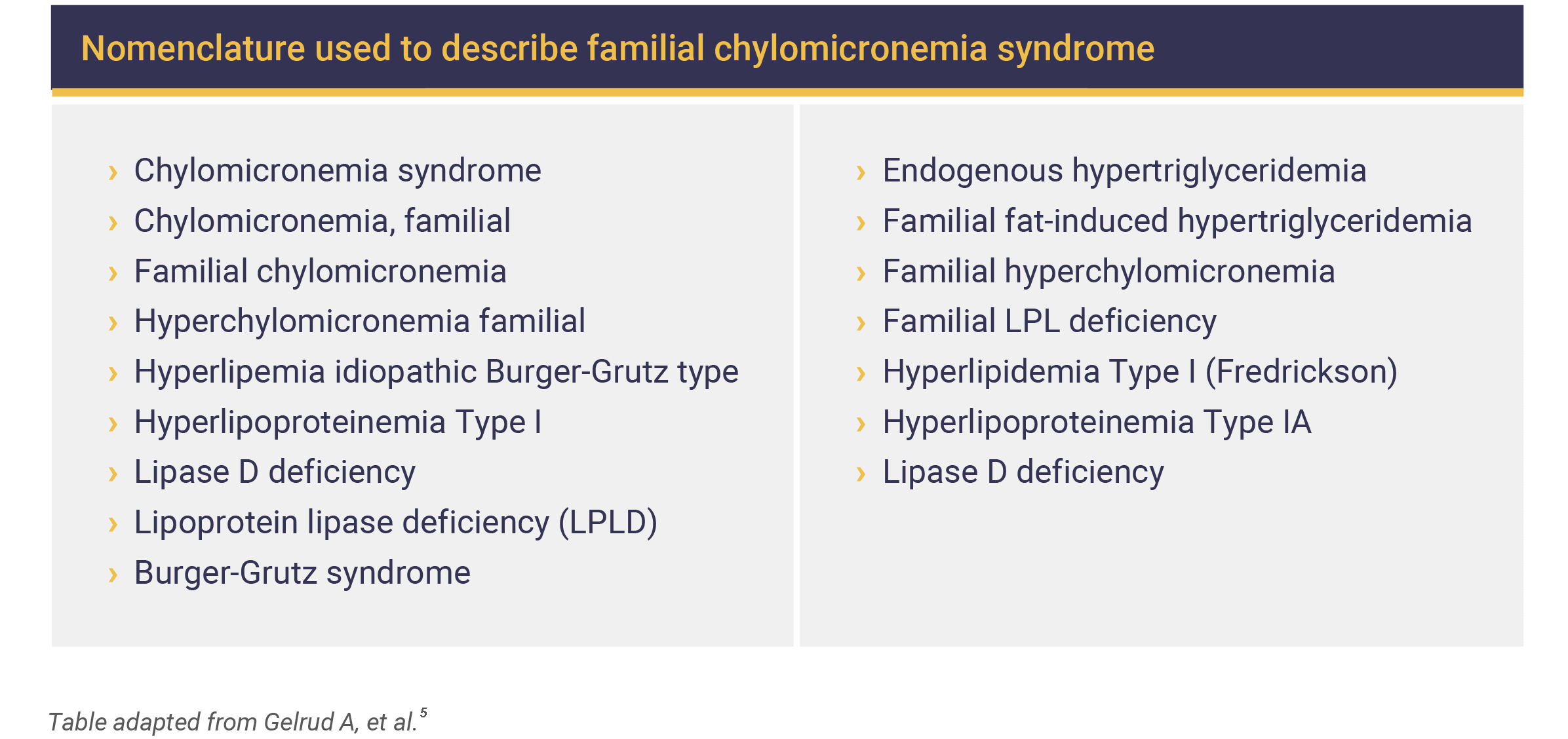 Familial chylomicronemia syndrome (FCS) is a rare, autosomal recessive disorder of chylomicron metabolism that results from loss-of-function mutations within the genes that encode key checkpoint molecules in lipolysis.1 FCS is characterized by impaired clearance of triglyceride (TG)-rich lipoproteins from plasma, leading to severe hypertriglyceridemia (HTG [TG levels >10 mmol/L] [>885 mg/dL]) and the abnormal persistence of chylomicrons in fasting plasma.1–3